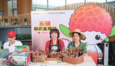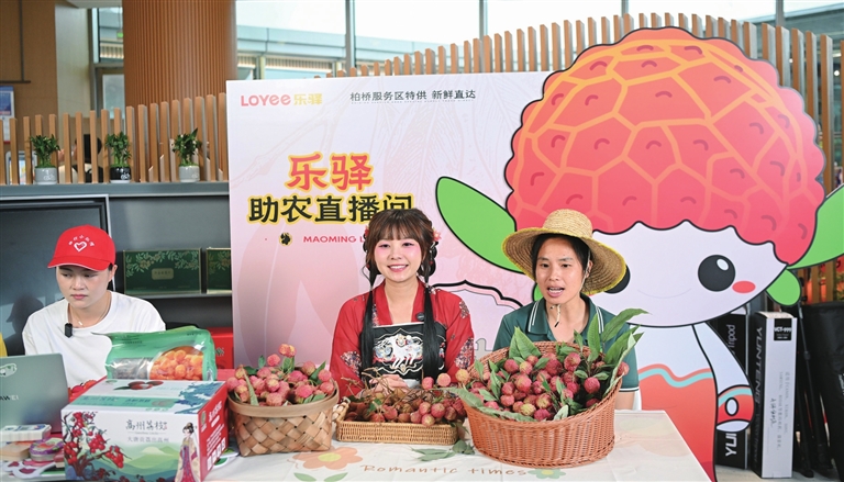 5月19日,在包茂高速柏桥服务区,主播在进行荔枝直播推介。