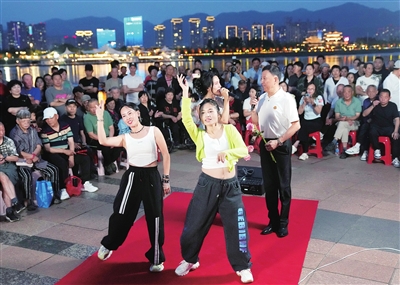 团队希望通过表演,在自娱自乐的同时为城市增加些文艺范、时尚味和烟火气。每次该主播团队演出时,周边的观众都有上百人。人们相聚一处,听歌曲看表演,放松身心,丰富业余文化生活。新华社 发