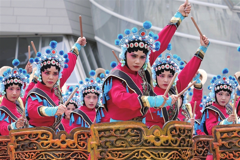 ○新华社巴黎5月30日电 29日,法国巴黎著名休闲游乐园巴黎风情园内,由125人组成的“陕西神木杨家鼓”表演团队敲响战鼓。铿锵激昂的鼓声伴随着热烈的掌声和欢呼声,将现场气氛推向高潮。