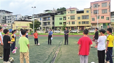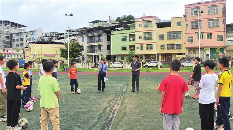 足球场上,随着哨声响起,由政法干警、足球教练和学生混编的队伍在绿茵场上激烈角逐。赛场上,裁判员化身“法治解说员”,将比赛判罚与法律知识相结合,让孩子们在观赛、参赛中学习法律知识。