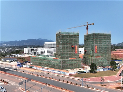 ■近日,龙川新城在建新地标龙川商会大厦酒店区及办公区的主体建筑实现封顶,整个项目按照计划将于明年底交付使用。